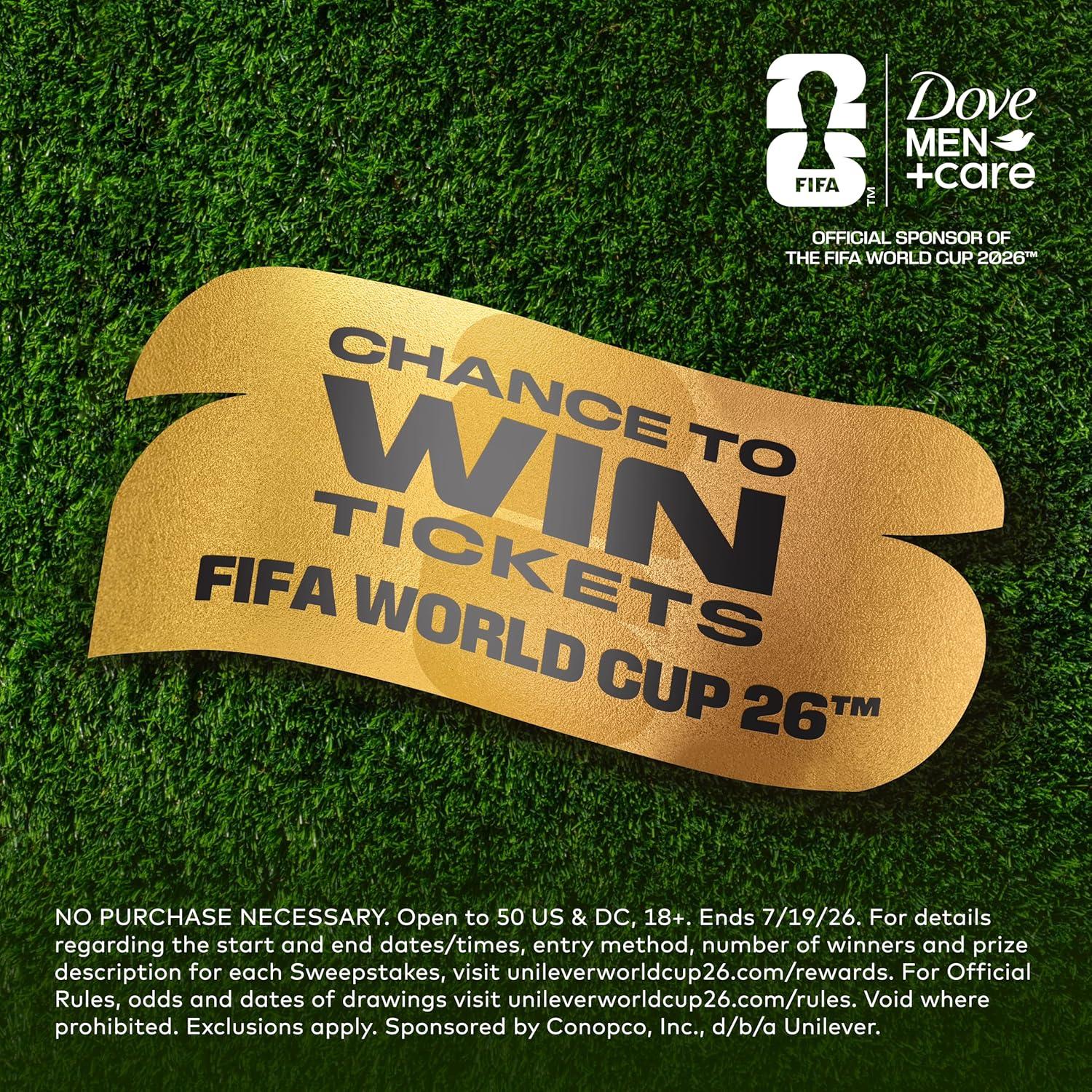 Level up your game day routine with Dove Men+Care’s All Star Comfort Body + Face Wash. Formulated with our MicroMoisture technology, our moisturizing body wash for men it provides 24-hour nourishment for healthier, smootherr-feeling skin. As you cleanse, millions of MicroMoisture droplets get to work, strengthening your skin’s natural moisture barrier and helping prevent dryness. Sulfate and paraben-free, Dove Men+Care’s All Star Comfort our body and face wash cleanses effectively without stripping your skin of essential moisture so it feels hydrated and smooth. Plus, because Dove Men+Care is an official sponsor of the FIFA WORLD CUP 2026, you can scan the QR code on the packaging for a chance to win tickets to the event.