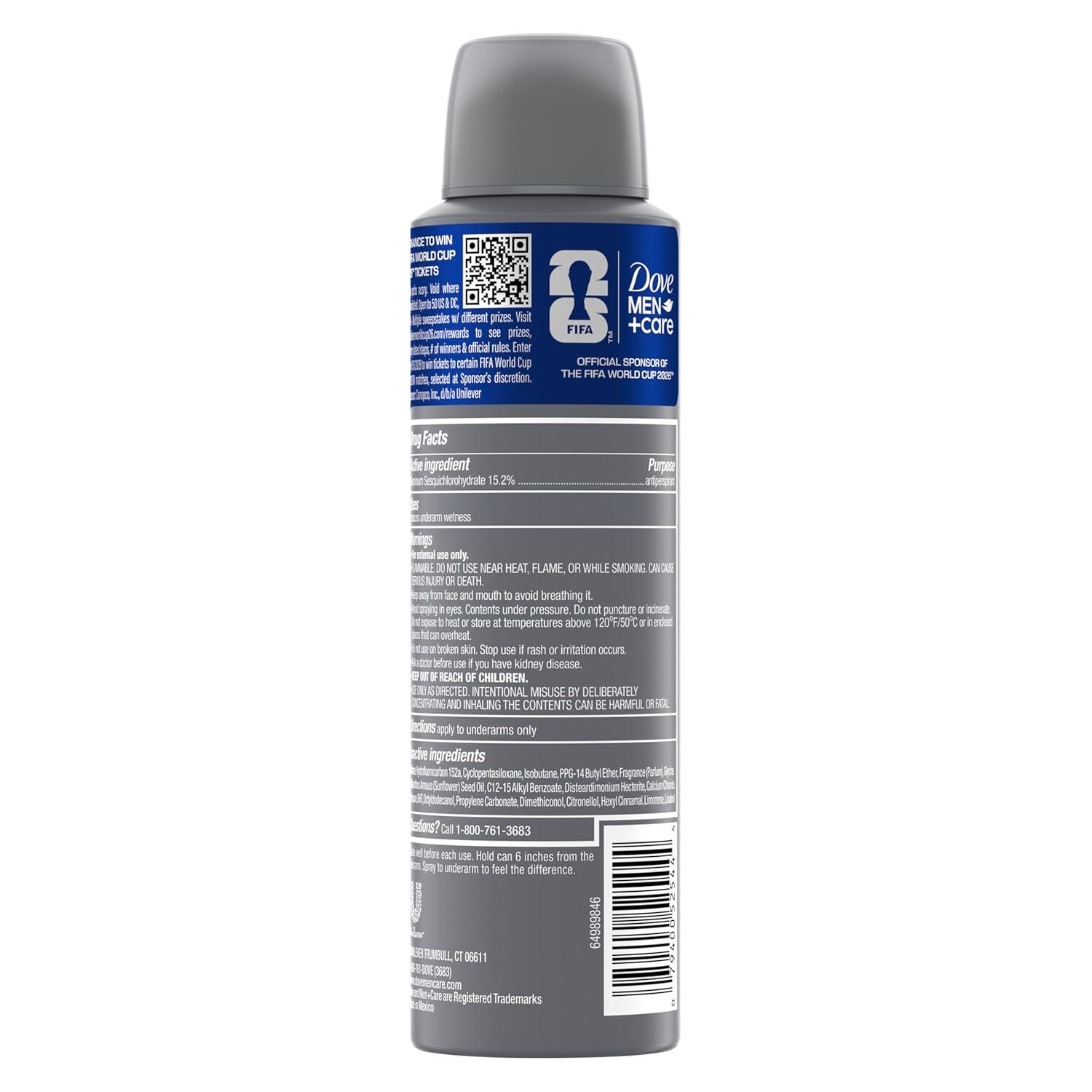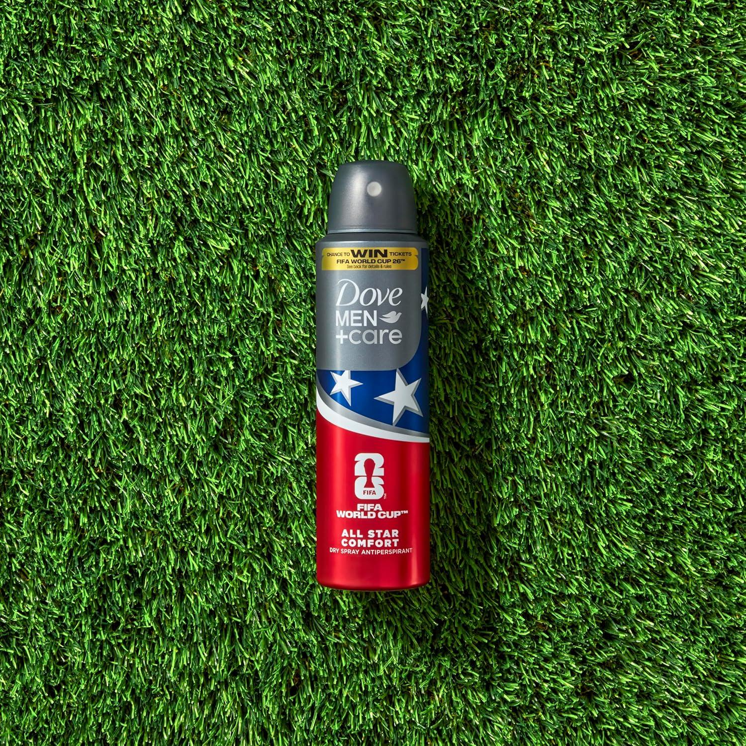 Dove Men+Care All Star Comfort Dry Spray Antiperspirant combines Dove Men’s superior care and protection with a Limited Edition design and fragrance inspired by World Cup 26. This product offers an impressive 72-hour protection, ensuring you stay fresh and confident throughout your day. Our unique formula neutralizes sweat and odor-causing bacteria, so you can trust that you'll remain odor-free, no matter what challenges come your way. Infused with a fresh and woody scent, this antiperspirant revitalizes your senses, making it the perfect choice for those who appreciate a subtle yet invigorating fragrance. The inclusion of added moisturizer means your skin is not only protected but also cared for, preventing dryness and irritation often associated with antiperspirants. Dermatologist-tested and certified cruelty-free by PETA, Dove Men+Care stands by its commitment to ethical and superior care. To use, simply shake the can well before each use, hold it 6 inches from your underarm, and spray. Experience the immediate difference in freshness and comfort. For optimal results, incorporate this antiperspirant into your daily routine alongside other Dove Men+Care products, creating a comprehensive care regimen that supports your skin's unique needs. This World Cup, upgrade to pre-game care that truly goes the distance.
